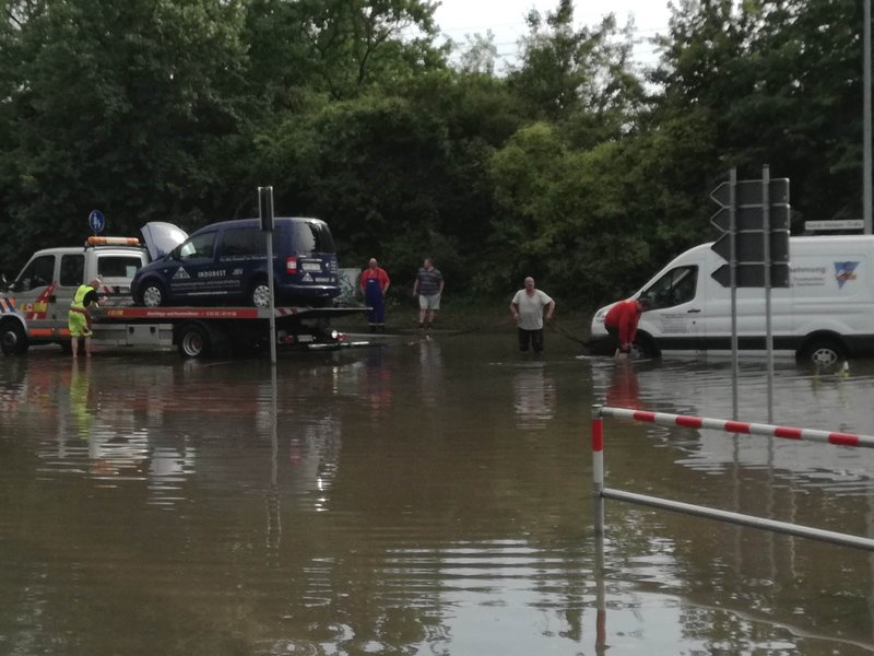 Auch wenn der Wasserstand sinkt, sollten Autofahrer vorsichtig bleiben. Wasserlöcher und überflutete Stellen dürfen nicht durchfahren werden. Denn selbst bei geringer Geschwindigkeit und niedrigem Wasserstand kann durch die Bugwelle ein Wasserschlag entstehen. Dabei tritt Wasser in den Ansaugtrakt des Motors und kann ihn zerstören. Eine Ausnahme stellen echte Geländewagen mit höher gelegter Ansaugöffnung dar. SUVs hingegen holen sich den Sauerstoff wie normale Pkw knapp über der Straßenoberfläche. Und damit im Zweifel unter der Wasseroberfläche. Auch Elektroautos sind weniger empfindlich, da sie keine Außenluft ansaugen. Trotzdem ist Vorsicht geboten. Wie tief das Wasser für eine Durchfahrt sein darf, ergibt sich aus der Betriebsanleitung.